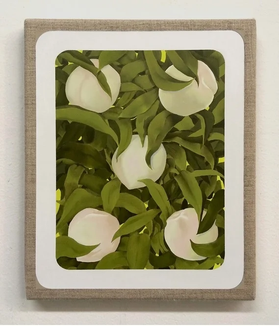 In the second gallery, a collection of paintings by Mika Horibuchi lines the wall, mirroring the composition of playing cards. Instead of diamonds and hearts there are soft and voluminous snow-white peaches, peaking out from a wall of crisp green leaves, gently rendered to achieve a level of sameness on the surface of the painting. Textually, these paintings are “read,” ushering with them a string of aphorisms whose echoes lightly hum in the viewer’s ears: luck of the draw; painting the roses red; wild card; follow suit; she has it in spades. These words, of course, are fantasies, but serve to underscore the paintings’ otherwise anxious relationship to the concept of tranquility—while the images seem serene and entirely convincing, their form places them in jeopardy. Horibuchi sets us up; our chips are all in, but what are we playing for?